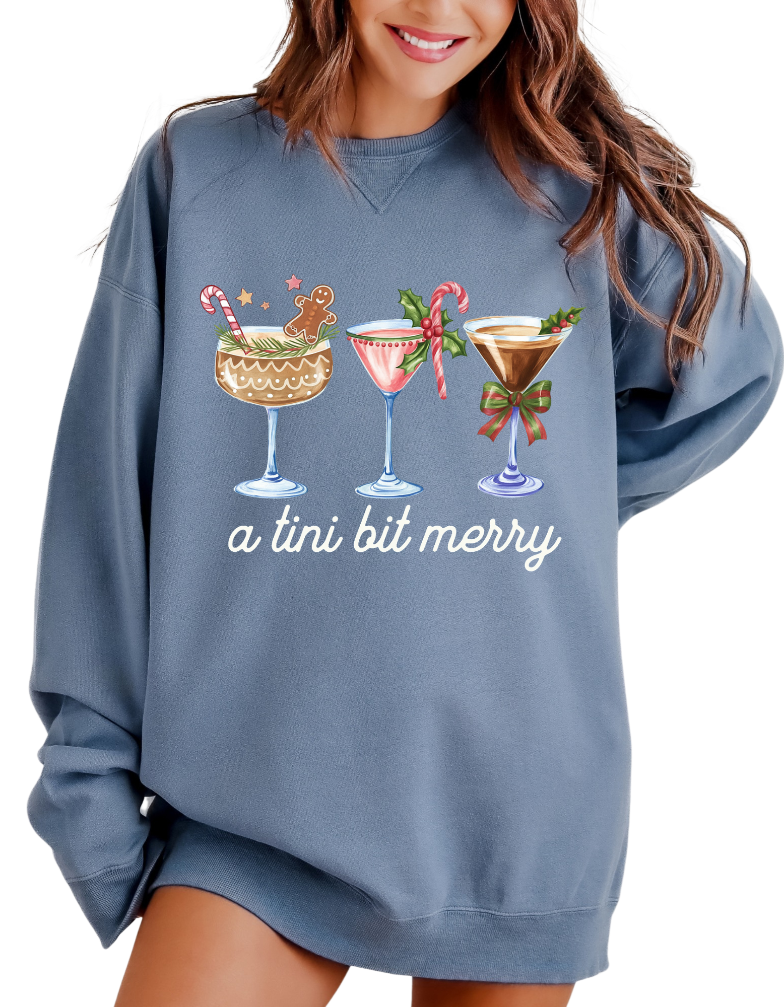 Sip, sparkle, and stay cozy this holiday season in our A Tini Bit Merry sweatshirt — the perfect blend of cute and classy Christmas cheer! Featuring a trio of hand-illustrated martinis topped with candy canes, holly, gingerbread, and bows, this crewneck is ideal for holiday parties, girls’ nights, or just feeling festive with your favorite cocktail in hand.