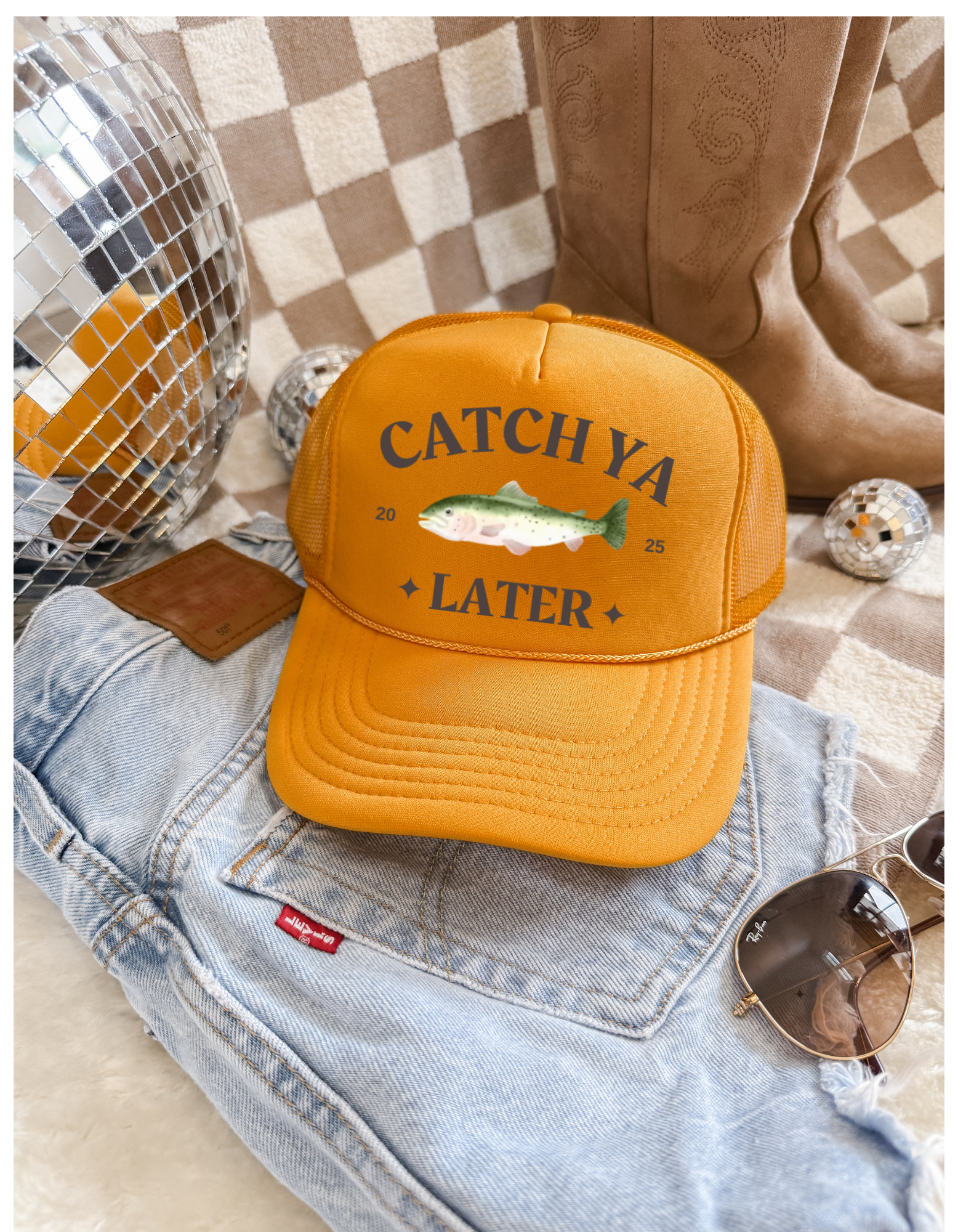 Say “Catch Ya Later” in style with this retro-inspired trucker hat that’s perfect for your next fishing trip, lake day, or country concert. Featuring a playful trout graphic and western lettering, this hat is made for the fun-lovin’, fish-catchin’, boot-wearin’ crowd.