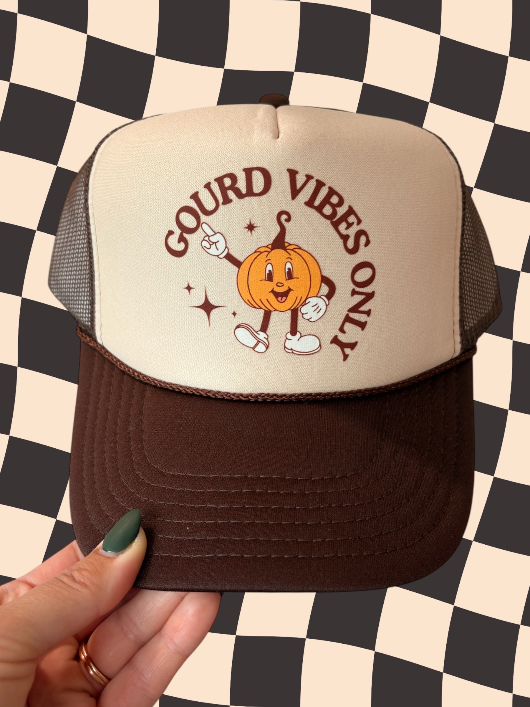 🍂 Gourd Vibes Only! This retro-style pumpkin trucker hat is the perfect fall accessory for anyone who loves cozy autumn vibes, pumpkin spice season, and festive fashion. Designed with a vintage cream and brown colorway, it features a cheerful pumpkin character and the playful phrase “Gourd Vibes Only.”