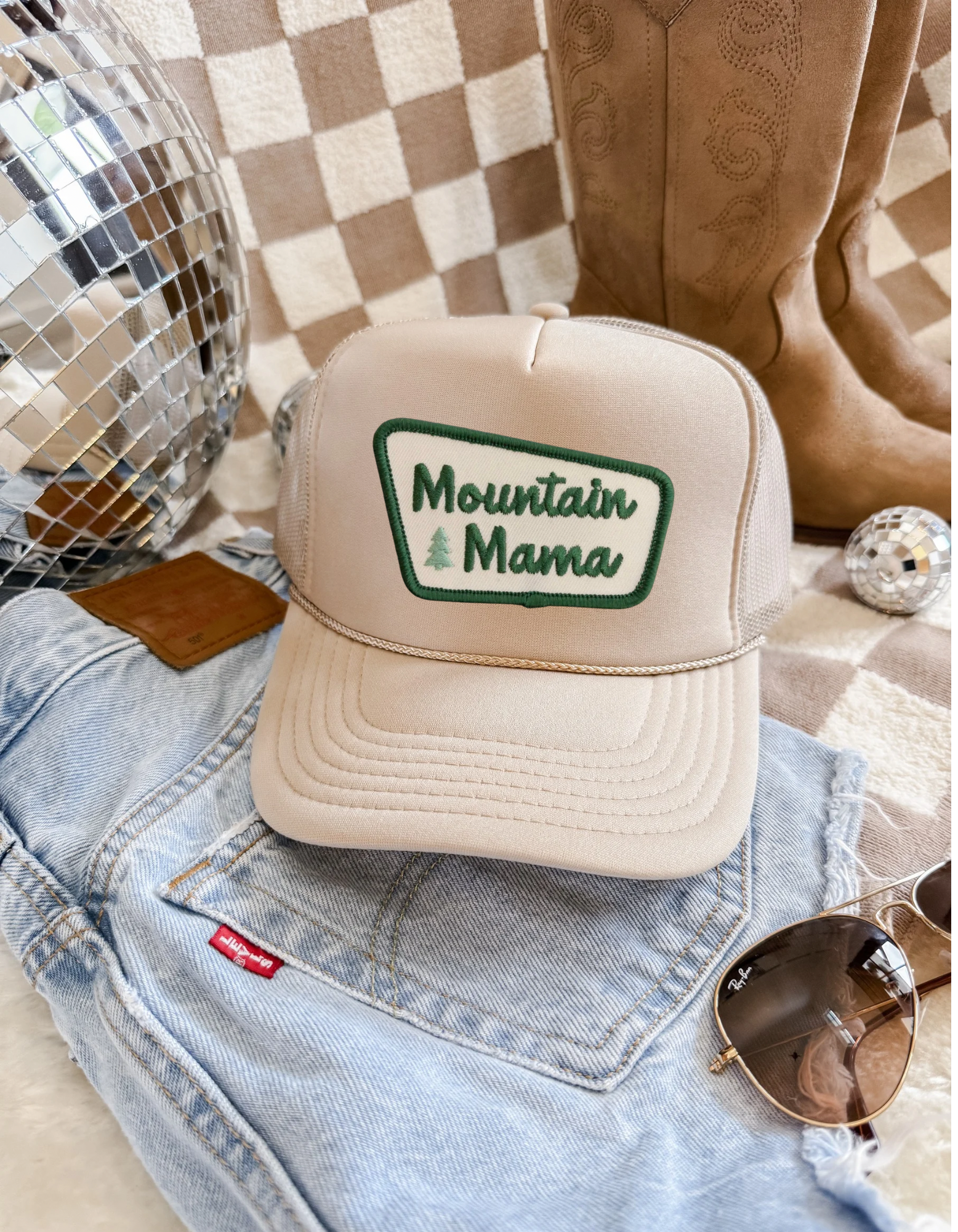 SEO Description: Cream trucker hat with forest-green embroidered “Mountain Mama” patch. Adjustable snapback, breathable mesh, everyday comfy fit—perfect for mountain lovers and outdoorsy moms.