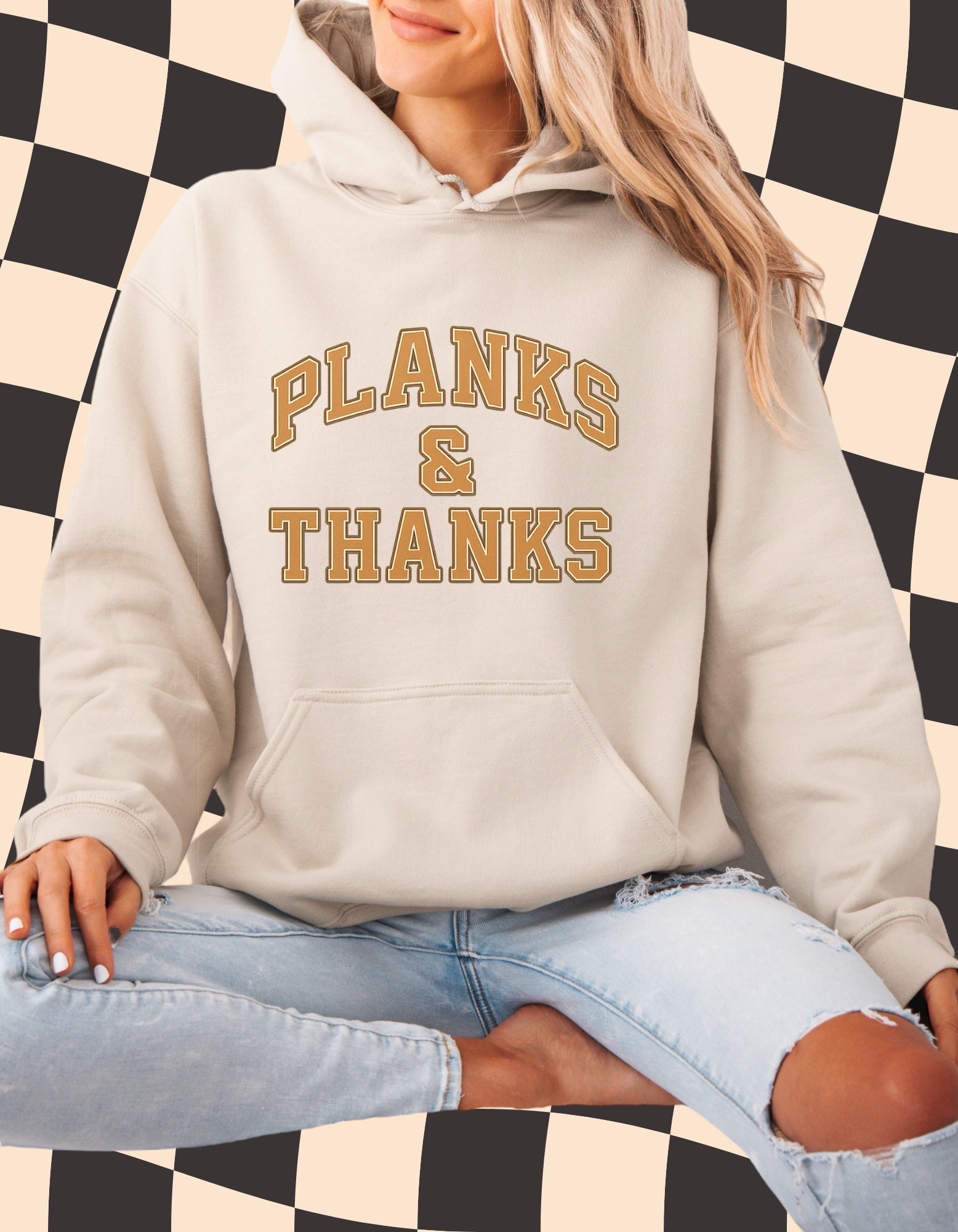Planks & Thanks Hoodie | Thanksgiving Pilates Sweatshirt | Cozy Neutral Fitness Hoodie for Women
