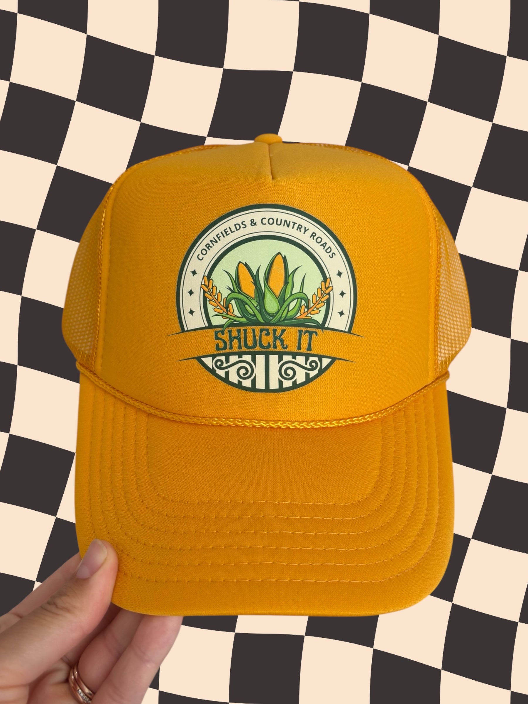 Bold, cheeky, and full of small-town charm — the Shuck It hat is made for country souls with a little bit of sass. Featuring a fun corn graphic with the phrase “Cornfields & Country Roads – Shuck It”, this mustard yellow trucker hat adds a pop of sunshine and humor to your everyday look.