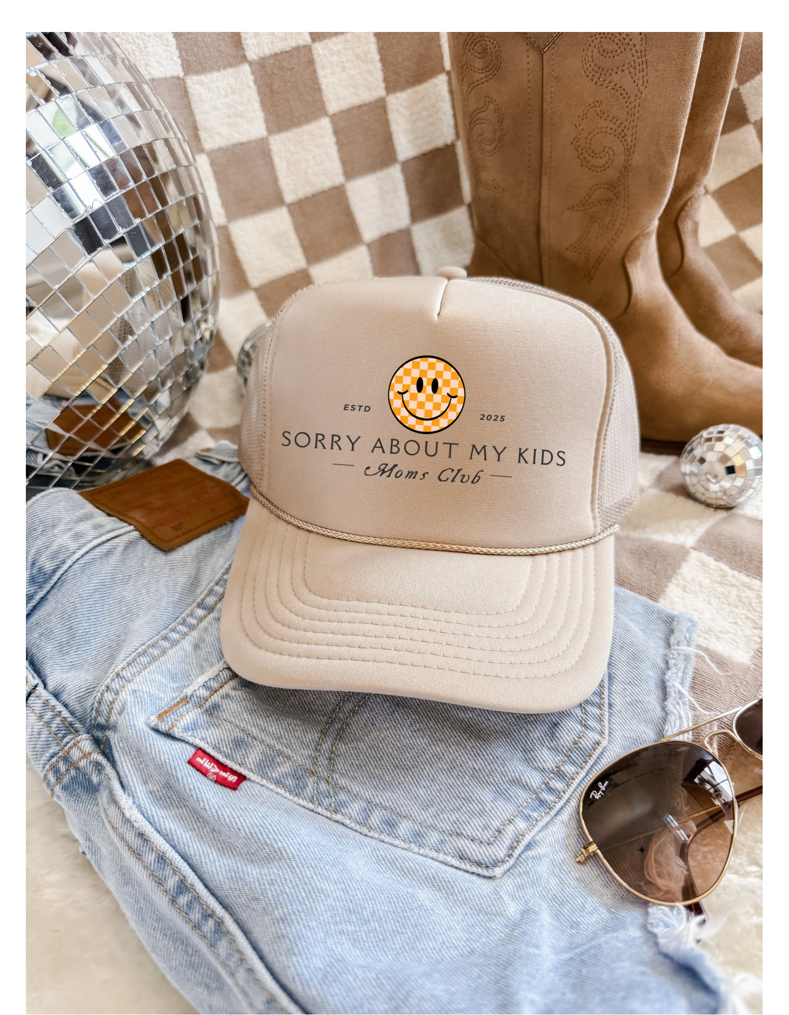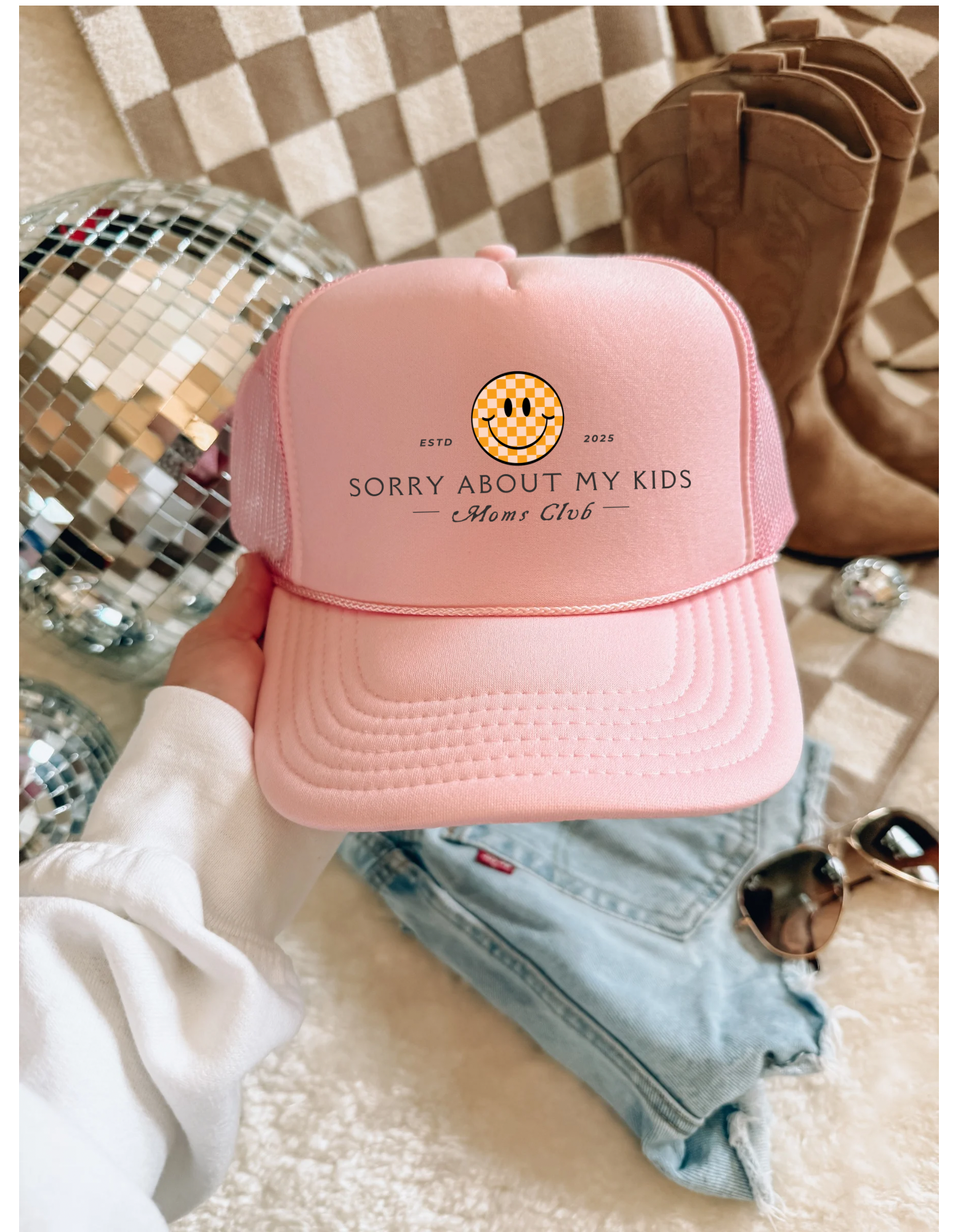 funny mom hat, sorry about my kids hat, mom life trucker cap, mom life accessory, tired mom hat, adjustable trucker hat, mom humor gift, sarcastic mom hat, gift for moms, motherhood trucker cap