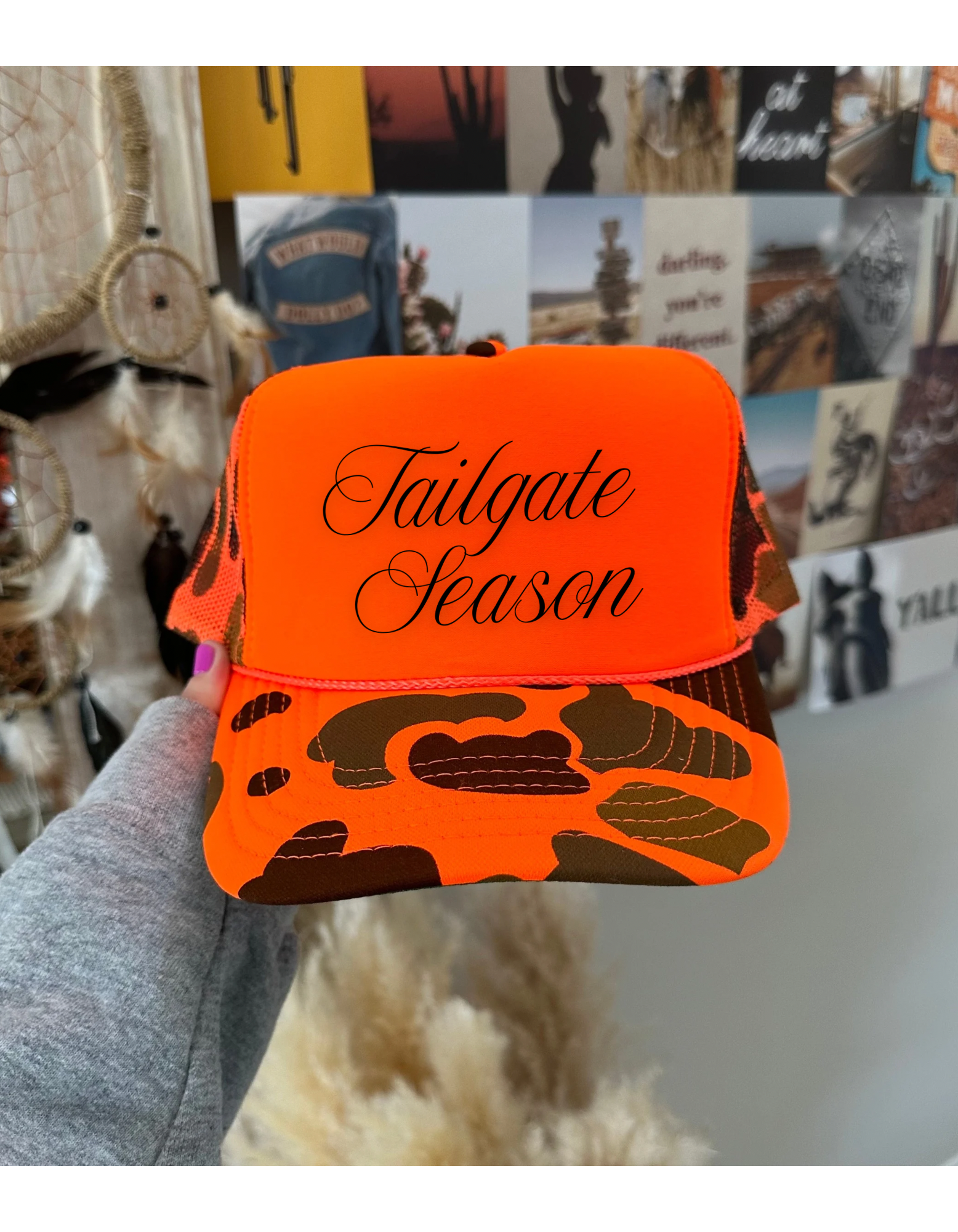 Get game-day ready with our bold and bright “Tailgate Season” Trucker Hat – the perfect accessory for fall football, bonfires, and backyard BBQs. Designed in a high-visibility blaze orange with rugged camo mesh accents, this hat is a head-turner for tailgaters, hunters, and country girls who know how to show up in style.